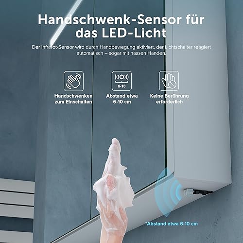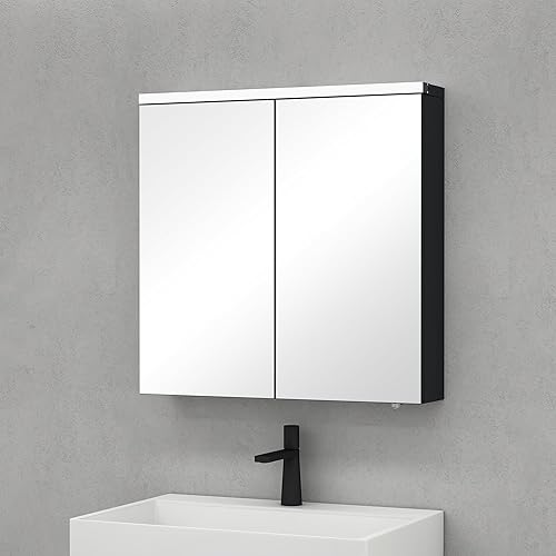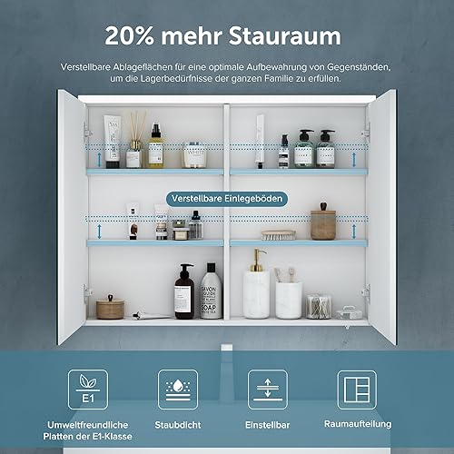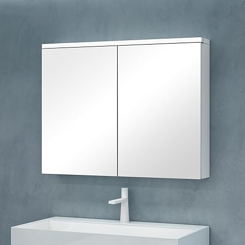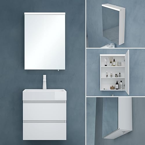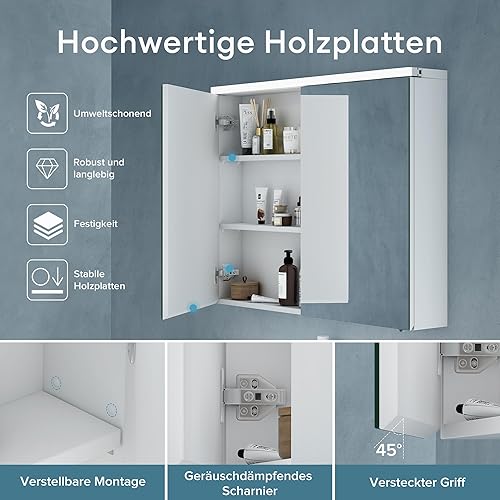 Sogood Armoire Murale Salle de Bains avec Miroir LED Placard de Rangement Étagères Réglable Blanc Mat en Bois Armoire de Toilette 2 Portes 70x15x70 cm Spiegelschrank 03