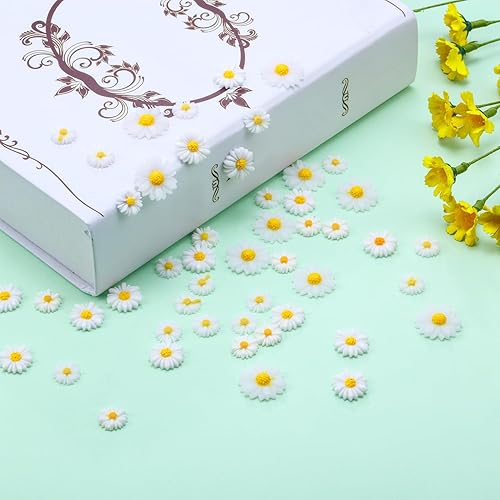 Hicarer 50 Petite Fleur de Marguerites en Résine Breloques de Fleur de Marguerite en Résine avec Boîte de Rangement pour DIY Fête d’Artisanat, 3 Tailles (Blanc et Jaune)