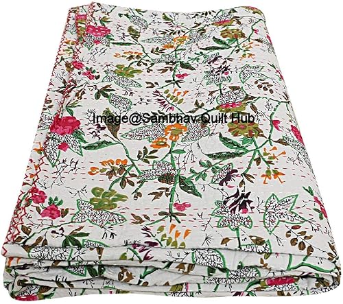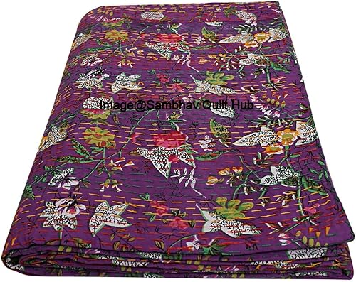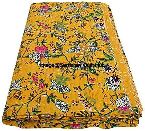 Couvre-lit réversible en pur coton style Kantha imprimé floral et oiseau - Pour lit king/lit jumeau - Noir - 274 x 274 cm