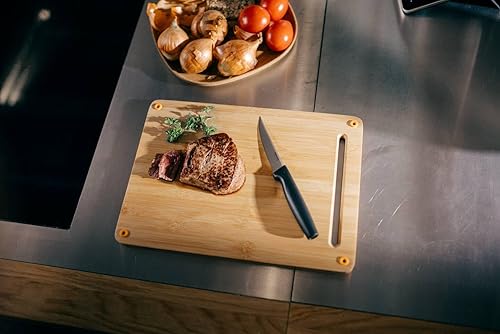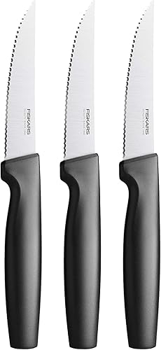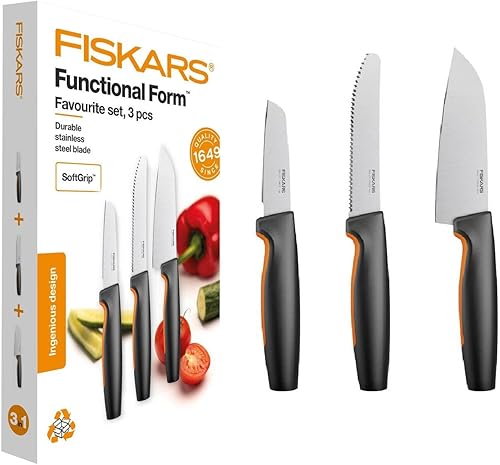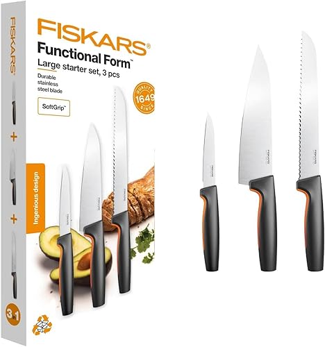 Fiskars Set de 5 Couteaux de Cuisine, Functional Form, inclus: Couteau de Chef (grand), Couteau à Légumes, Couteau à Tomates, Couteau Santoku et Couteau à Pain, Inox Japonais/Plastique, 1057558