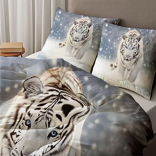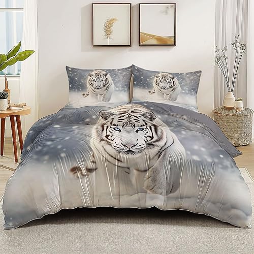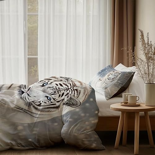Housse De Couette Réversible Animaux Tigre Hiver Neige Motif, Microfibres D'été Parure De Lit pour Chambre 140 x 200 cm avec 2 Taie d'oreiller pour Adolescents Adultes, Gris