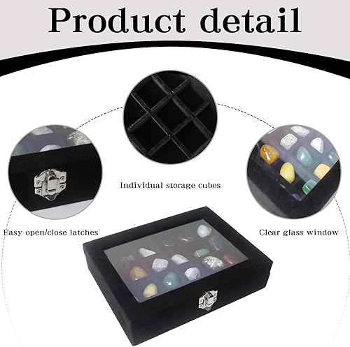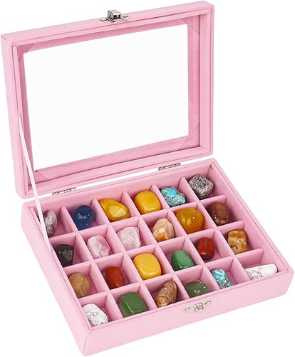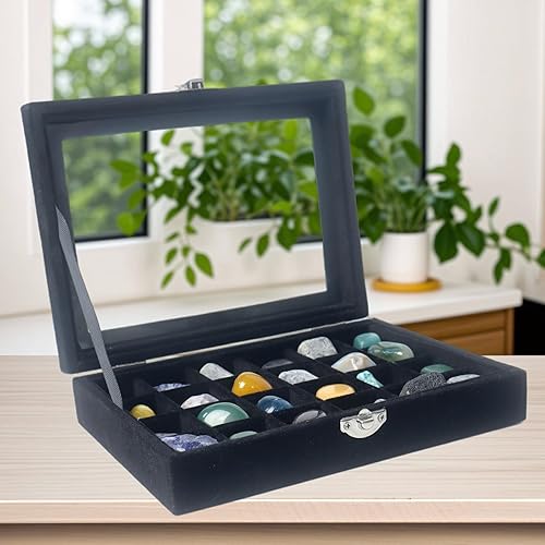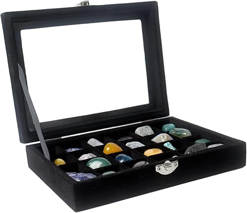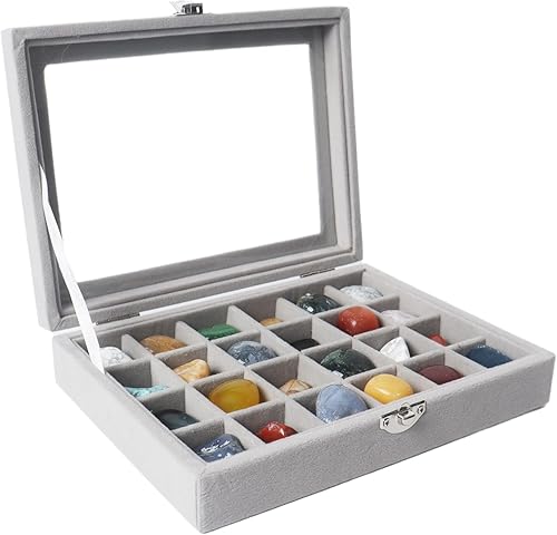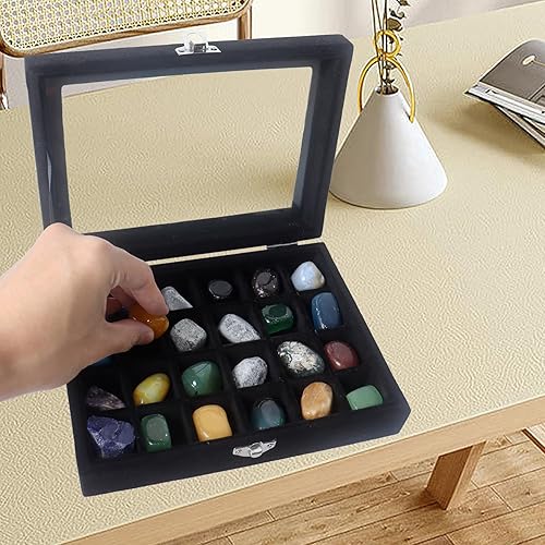 Dmnnlp Velvet Rock Boîte de présentation à 24 compartiments avec couvercle en verre transparent, boîte de rangement pour petites pierres précieuses fossiles, bagues, boucles d'oreilles, breloques