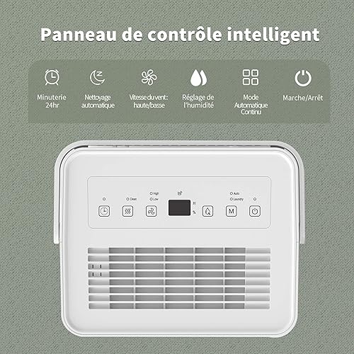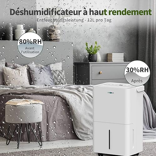 Uhome Déshumidificateur électrique, 12 l/24 h, déshumidificateur d'ambiance 54 m³/18 m², avec arrêt automatique, capteur d'humidité, mode lavage et filtre à charbon actif, tuyau d'arrosage