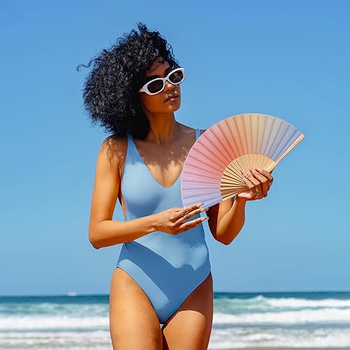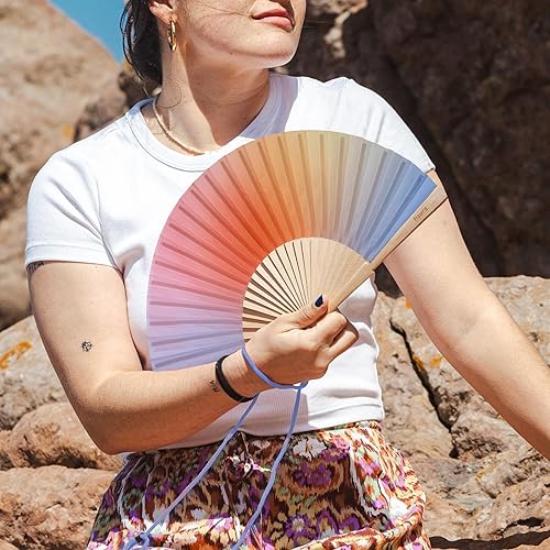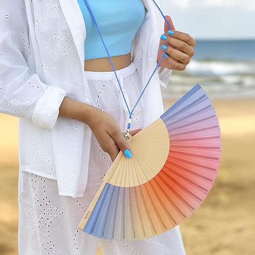 Fisura – Éventail en Bois au Design dégradé Bleu et Orange. Accessoire Original et coloré, Ventilateur de Main Moderne avec Crochet Inclus. Dimensions : 42,5 x 23 cm