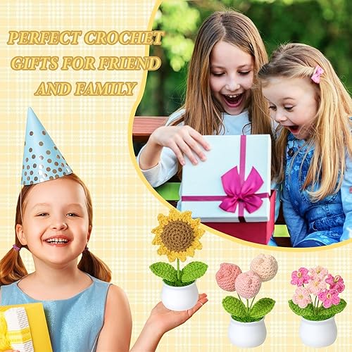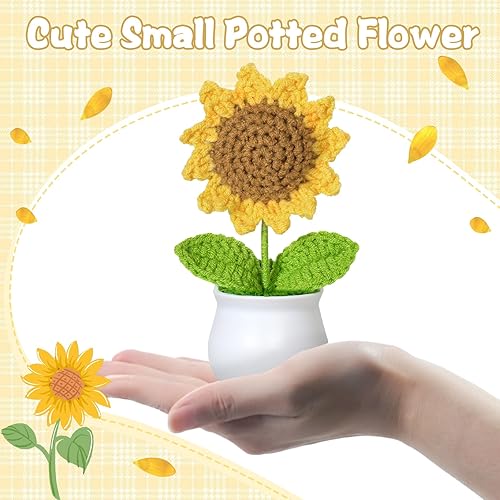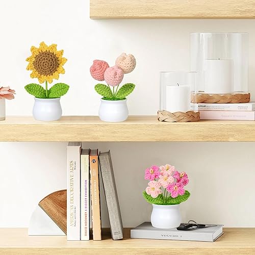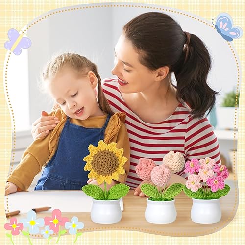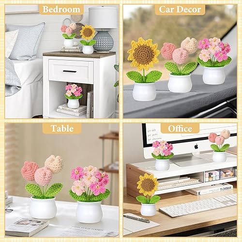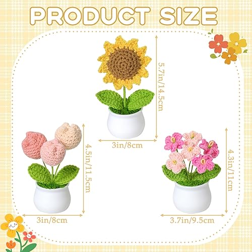 Weldomcor Lot de 3 bouquets de fleurs en pot tricotées à la main - Tulipes artificielles - Kit de tournesol pour maison, bureau, voiture, table, cadeau de soutien émotionnel