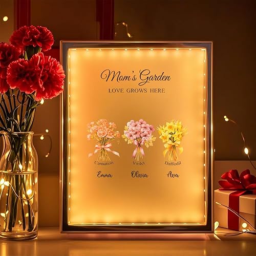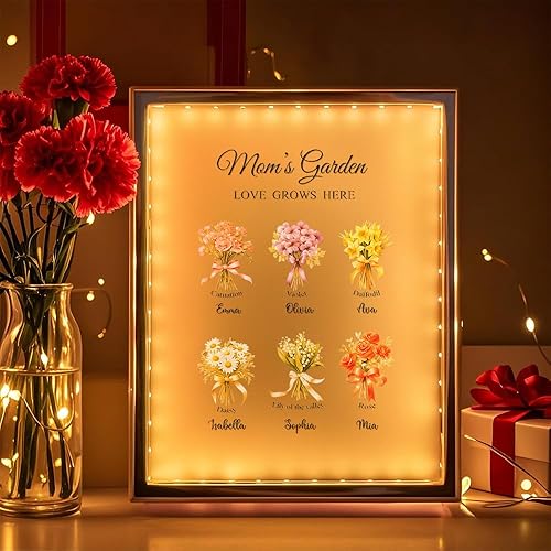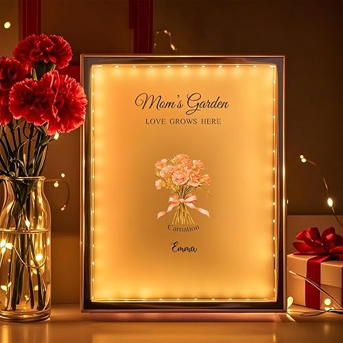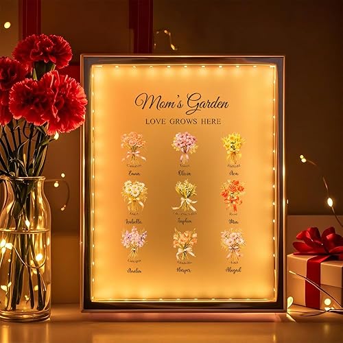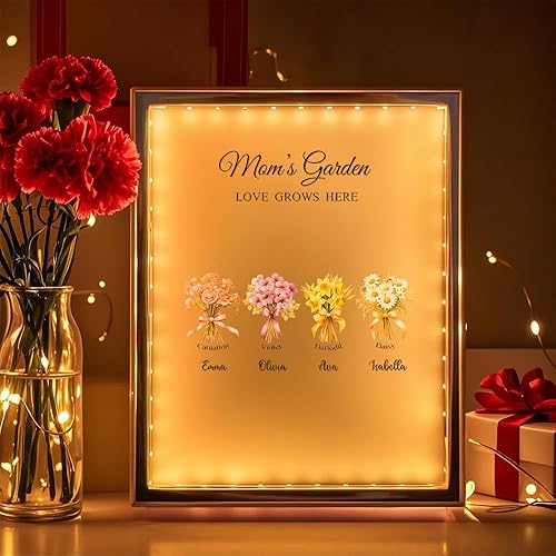 Soview Lampe Miroir Personnalisée pour Maman LED Lumière de Nuit avec Nom et Fleur de Naissance Cadeau pour Fête des Mères Anniversaire Grand-mère Épouse Famille Fille, Onze fleurs