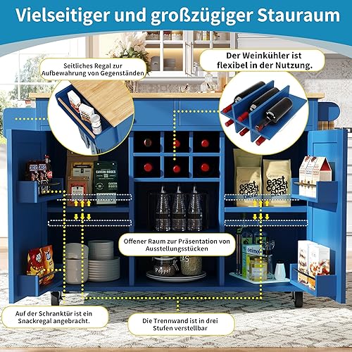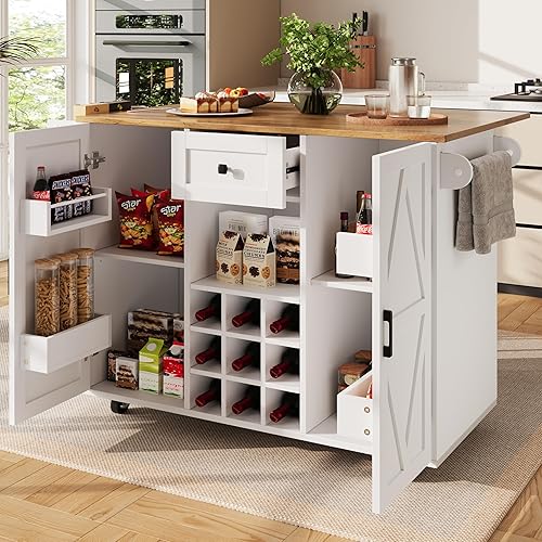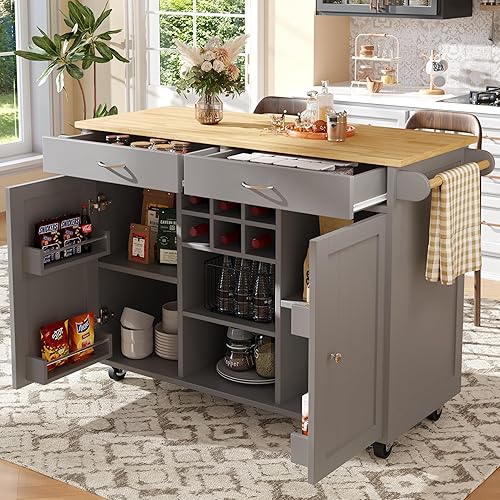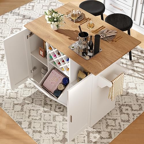Merax Îlot de cuisine mobile avec plan de travail, chariot d'îlot de cuisine sur roulettes avec 2 portes, étagère à vin, compartiment de rangement ouvert, porte-serviettes, chariot de service en bois
