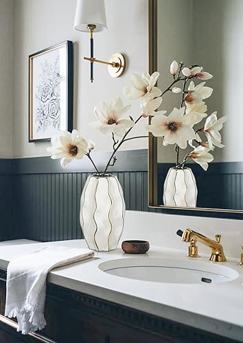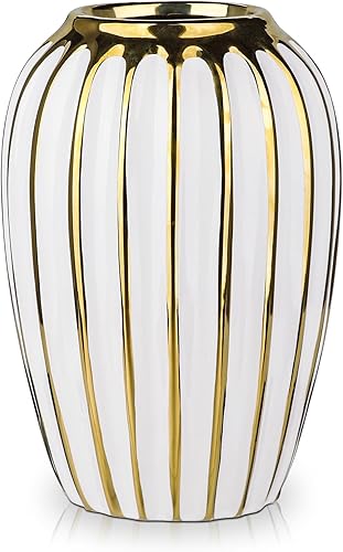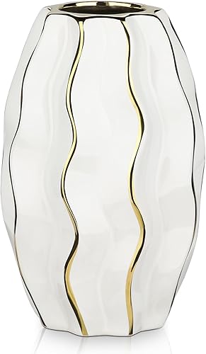Hollyone Vase en céramique blanc et doré pour fleurs - Vase décoratif moderne à rayures verticales - Vase ondulé texturé pour chambre à coucher, bureau, salon, salle de bain, table