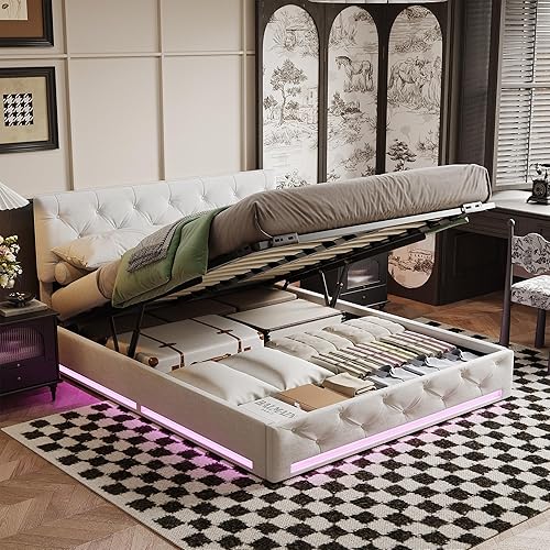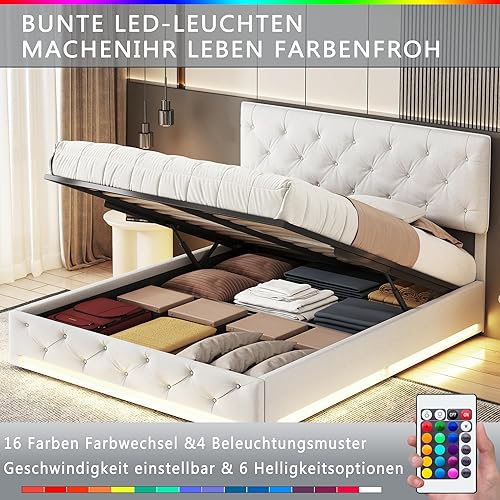 Fofetbfo LIT Coffre capitonné 140x200 avec LED, Lit Double avec tête de lit réglable en Hauteur et sommier, lit 2 Personnes avec hydraulique Espace de Rangement, sommier à Lattes, Beige (140x200)