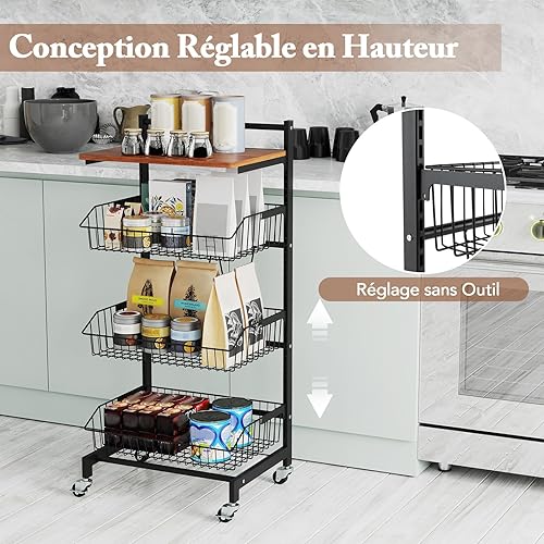 COSTWAY Chariot de Rangement à roulettes, Desserte 4 Niveaux, Paniers Réglables en Hauteur et Amovibles, Plateau Supérieur en Bois, Etagere Cuisine pour Snacks Fruits Légumes, 40 × 31 × 88 cm