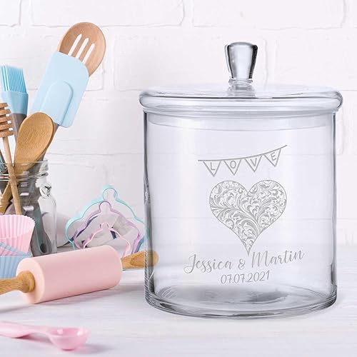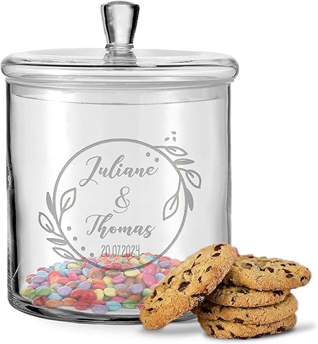 GRAVURZEILE Leonardo Bocal à biscuits avec gravure – Boîte à biscuits en verre avec couvercle – Boîte de conservation personnalisable avec nom et date – Cadeau pour les couples ou pour un mariage