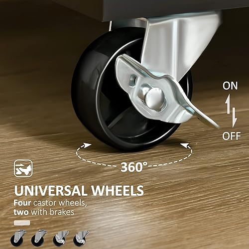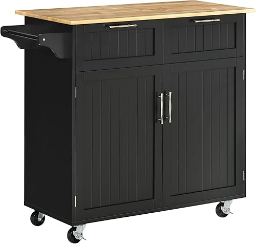 HOMCOM Isola Cuisine avec plan de travail en bois de caoutchouc, chariot de cuisine avec roues, 2 tiroirs, armoire, étagères réglables et porte sèches, en bois MDF, 104 x 46 x 91 cm, noir