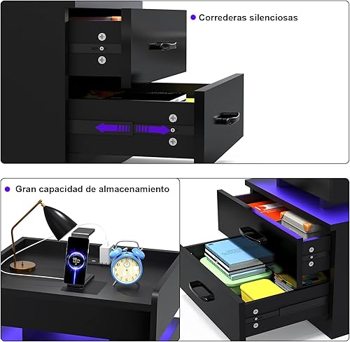Lvhecforhm Table de Chevet avec Station de Charge, LED Réglable Chevet, Intelligente Table de Nuit avec Prise et Port USB, Moderne Haute Brillance avec 2 Tiroirs Blanc