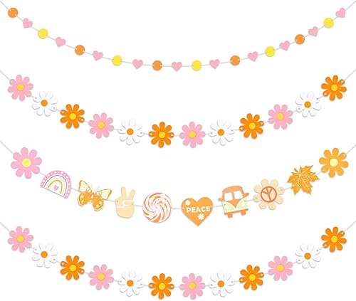 Qpout Lot de 4 décorations de fête en feutre groovy comprenant une bannière hippie bohème groovy boho guirlande de marguerites rondes et une guirlande de cœur pour fenêtre murale, décoration de fête