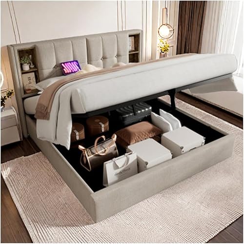 Sapgaks Lit capitonné 160x200 cm, avec Port USB, rangements, Lin, Structure en Bois, Coloris Naturel (Matelas Non Inclus)