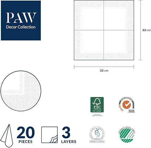 PAW - Serviette Papier 3 Plis (33 x 33 cm) I Lot de 20 I Parfait pour les Anniversaires, les Partys, les Mariages, la Kommunion et les Célébrations I Décoration de Table - Eucaliptus Doré