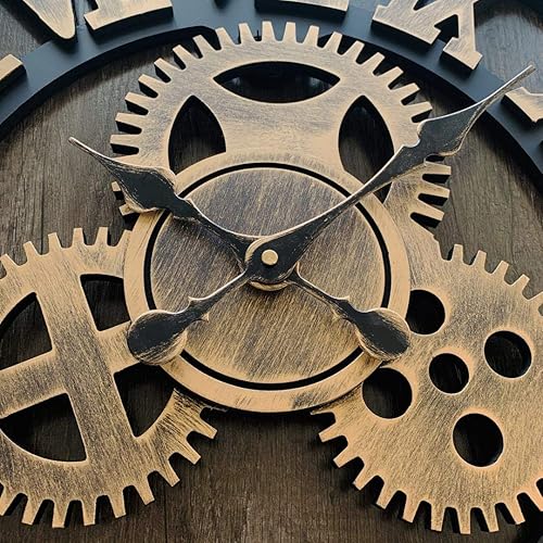 Xiaoyezi 3D Horloge Murale 80 * 80cm Grand Classique Vintage en Bois Silencieux Rétro Vitesse Pendaison Horloge Chiffre Romain Style Européen Steampunk Décor Industriel pour Salon, Bar,d'or