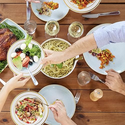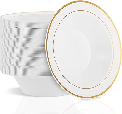AKOLAFE Lot de 40 bols à soupe en plastique blanc avec bord doré - 350 ml - Réutilisables - Pour fête, mariage, anniversaire, Noël, Pâques