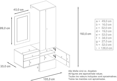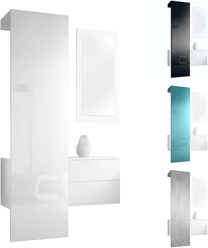 Vladon Penderie Carlton Set 2, Meuble d’entrée Comprenant 1 Panneau Porte-Manteau, 1 Coffre à tiroir et 1 Miroir Mural, Blanc Mat/Noir Haute Brillance (105 x 193 x 35 cm)