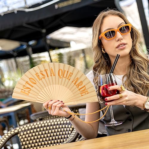 Fisura – Éventail en Bois Original avec Message “está Que arde”. Accessoire Moderne et coloré, Ventilateur à Main Jaune avec Crochet Inclus. Dimensions : 42,5 x 23 cm