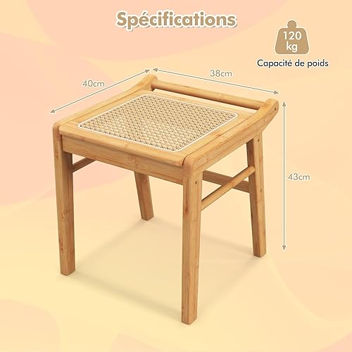 COSTWAY Tabouret de Coiffeuse en Bambou, Pouf Ottoman avec Dessus en Rotin, Petit Tabouret de Maquillage pour Chambre à Coucher, Salle de Dressing, Salon