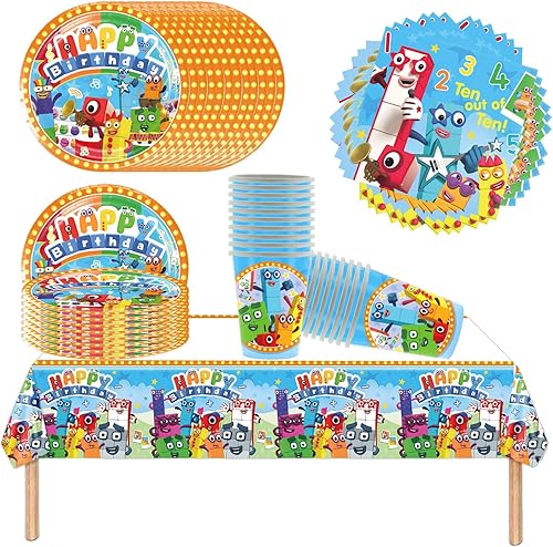 Digital Blocks Set de vaisselle pour enfants, Cartoon Blocks Party, comprenant tasses, serviettes, assiettes, nappe, convient pour les anniversaires d'enfants