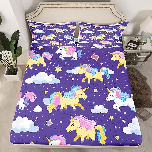 Homewish Drap Housse 90x190 Enfant Fille Licorne Mignonne, Drap-Housse Licorne Arc-en-Ciel 1 Personne, Drap de Lit Ciel Étoilé Étoiles et Nuages, Housse de Matelas Licorne avec 1 Taie d'oreiller