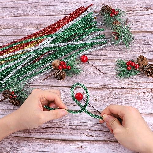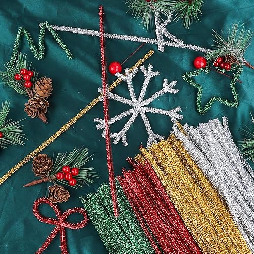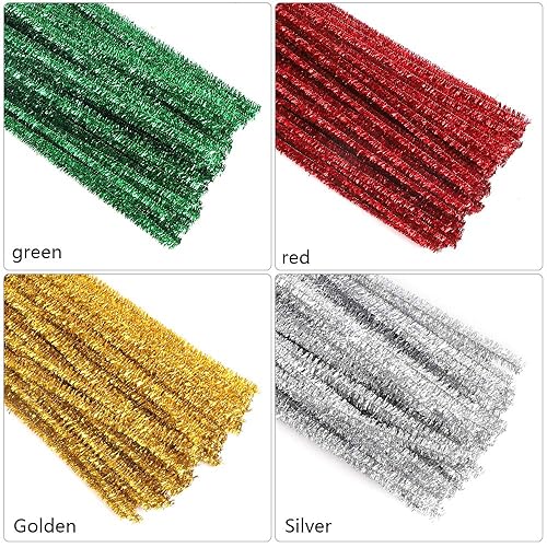 Cure-pipes à paillettes,400 pièces de cure-pipes métalliques de Noël Tinsel Chenille pour artisanat créatif bricolage,arts,mariage,maison,fête,décoration de vacances (rouge,or,argent,vert)