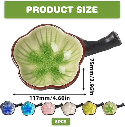 Lot de 6 bols à sauce, en céramique, en forme de fleur, avec poignée, pour sushis, entrées, ketchup, graines de soja, sauce soja, vinaigre (11,7 x 7,5 x 1,8 cm)