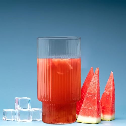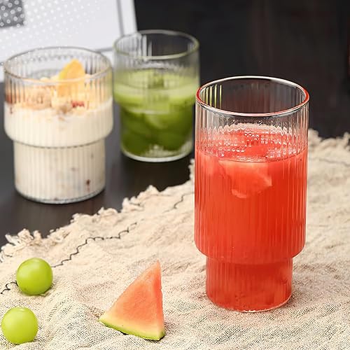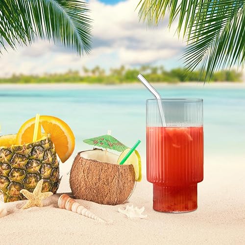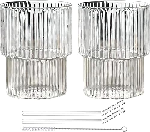 Lot de 2 verres nervurés de 300 ml/480 ml avec 2 pailles en verre pour café glacé - Vintage - Réutilisables - Verrerie transparente pour jus, thé, café, coocktail (300 ml)