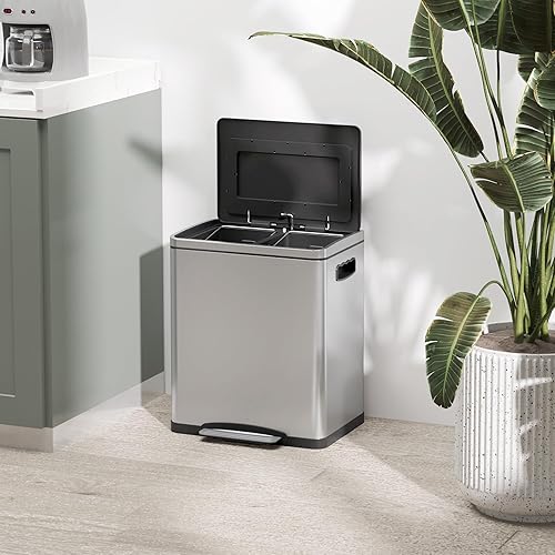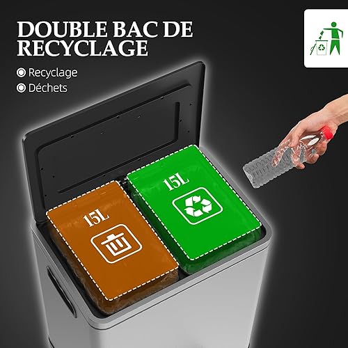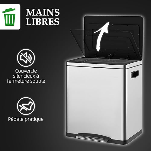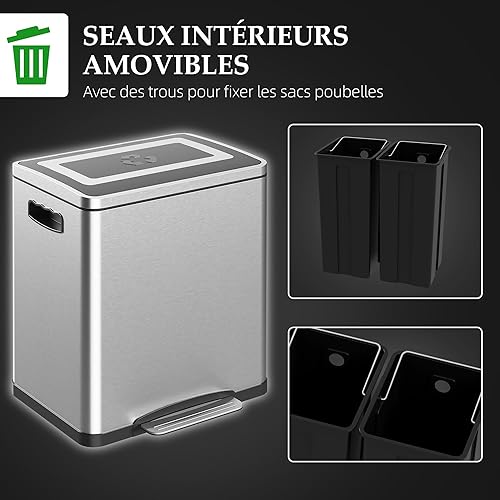 HOMCOM Poubelle de cuisine de 2 x 15L poubelle à pédale 2 compartiments, en acier inoxydable avec couvercle à fermeture douce, seaux amovibles, 40L x 34,8l x 47,5H cm argent