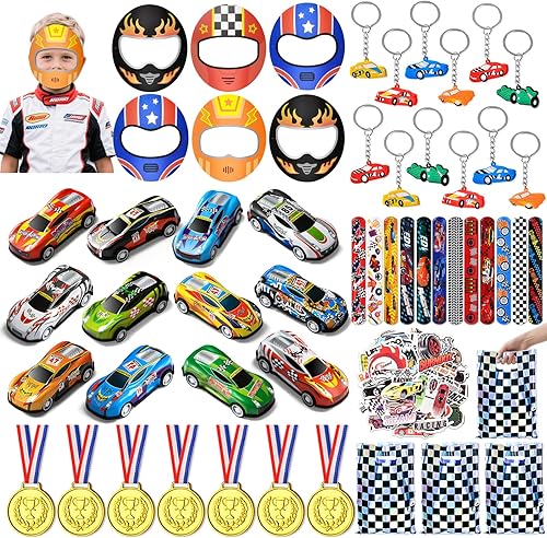 PtyPop 122 Voiture de Course Cadeaux Anniversaire Invités Enfant, Petits Cadeaux Anniversaire avec Mini Voiture Friction, Masque, Porte Clé Bracelet, Courses Pinata Anniversaire Garcon