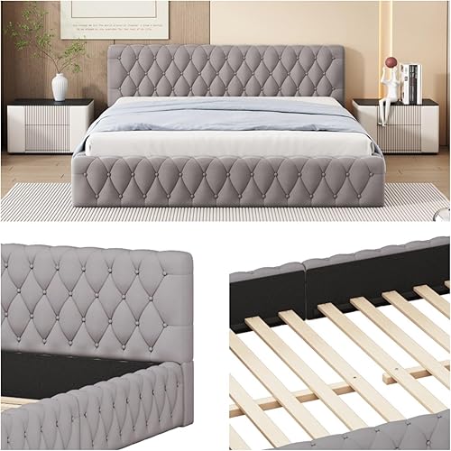 KOMHTOM Lit en Velours avec sommier à Lattes Lit Double avec tête de lit, lit Moderne capitonné Gris Sommier 140x200(Matelas Non Inclus) (Gris)