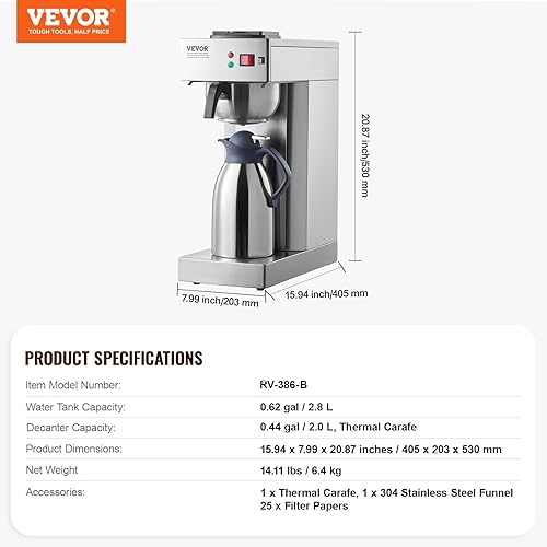 VEVOR Cafetière Filtre Commerciale Capacité 12 Tasses, Machine à Café Filtre Électrique, avec Carafe Thermique pour Garder au Chaud ou au Froid, en Acier Inoxydable pour Restaurant, Bureau, Café