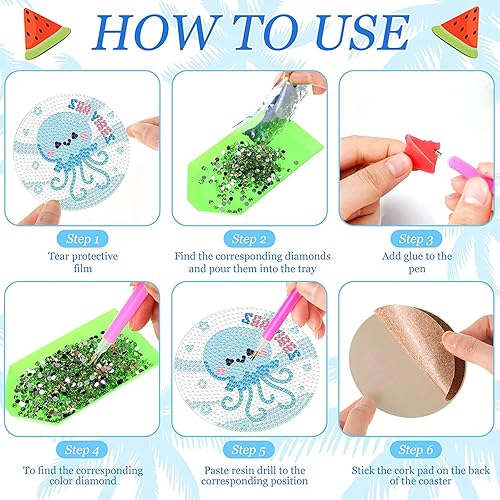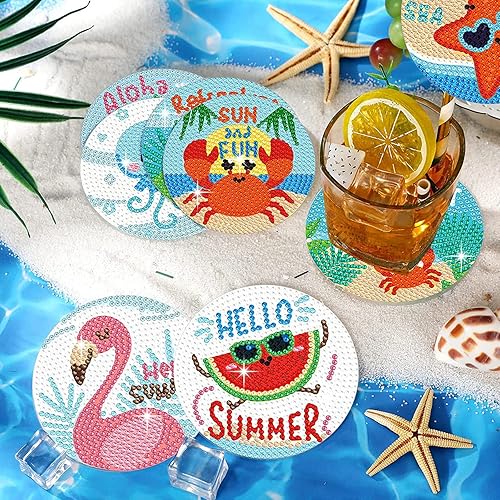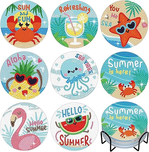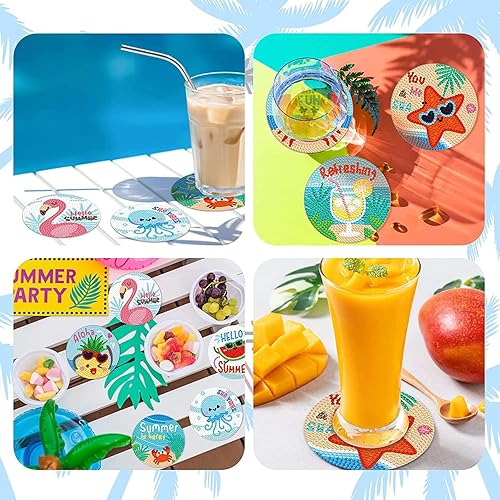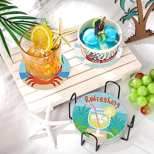 8 Pièces 5D DIY Diamant Peinture Dessous de Verre avec Support 9.5cm Style Aloha Diamant Rond Arts et Artisanat Peinture Dessous de Verres DIY Tasse Boissons sous-Verres pour Enfants Adultes Débutants
