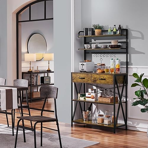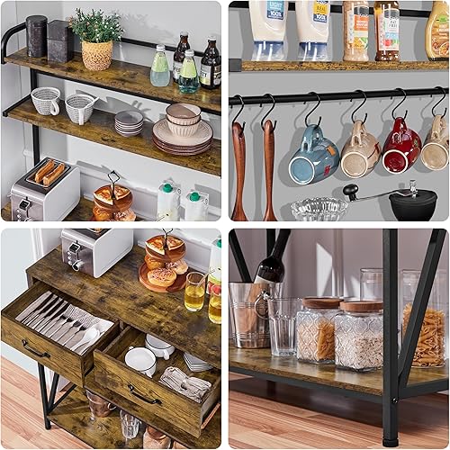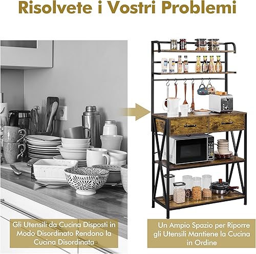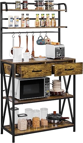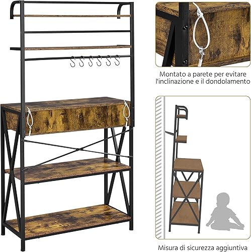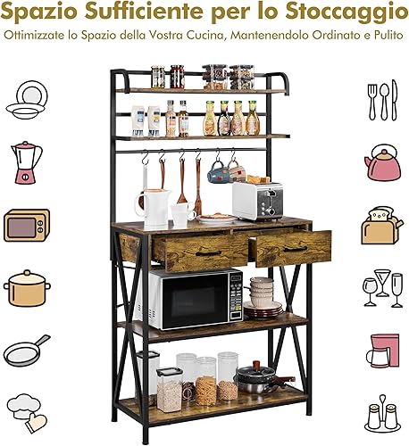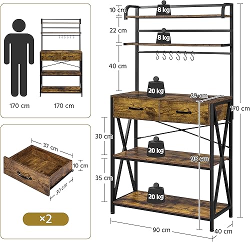 Yaheetech Étagère de Cuisine à 5 Niveaux Design Industriel Étagère pour Micro-Ondes/Four avec 2 Tiroirs 6 Crochets Meuble de Rangement Plan de Travail 170 cm de Haut Brun Rustique