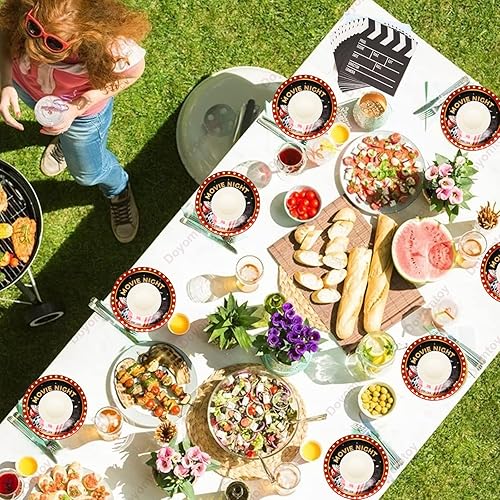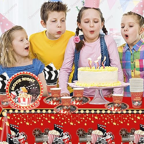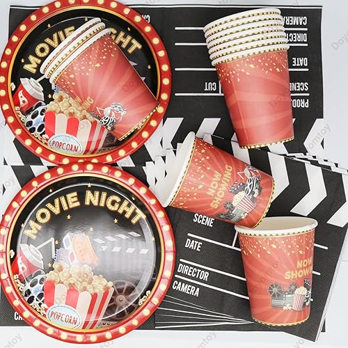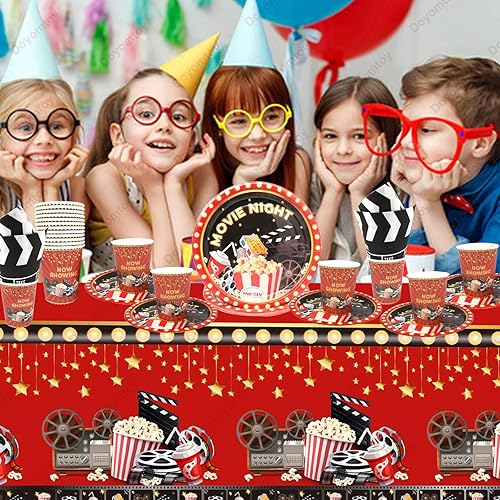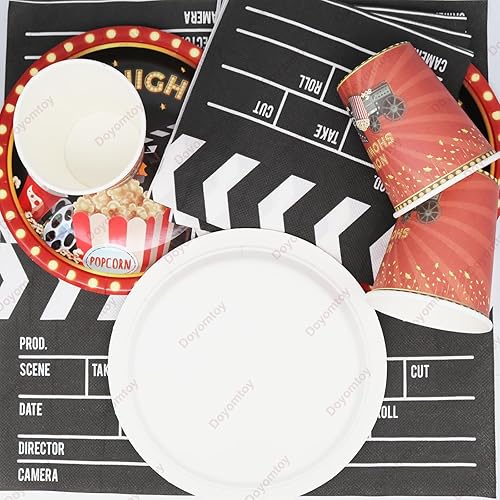Doyomtoy Décorations pour Soirée Cinéma,53 Pièces Movie Night avec Assiettes,Set de Table pour Soirée Cinéma,Gobelets,Serviettes,Nappe-Pour 16 personnes Parfait pour Décoration de fête