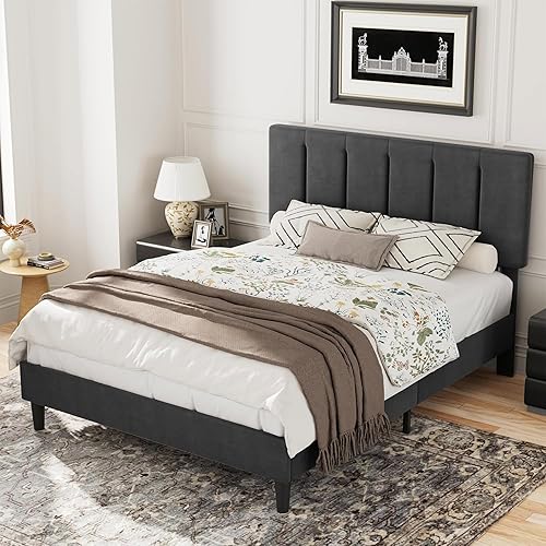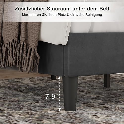 VECELO Lit Double rembourré, 140 x 200 cm, avec tête de lit réglable en Hauteur, sommier à Lattes avec revêtement en Velours, Montage Facile, Gris