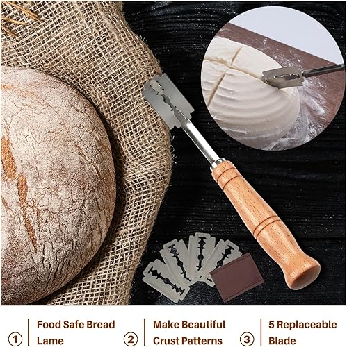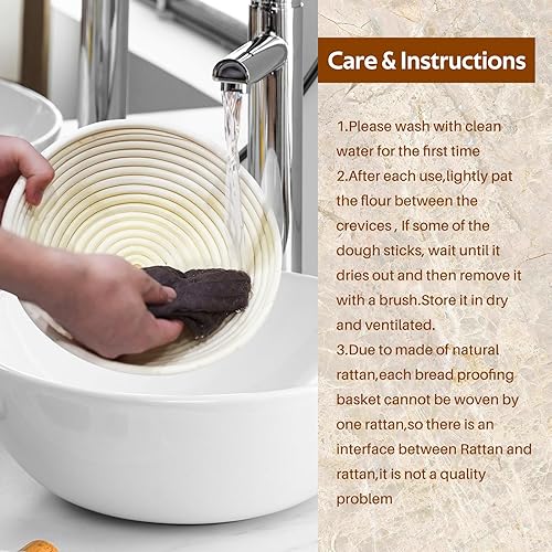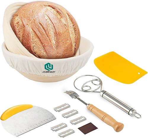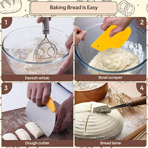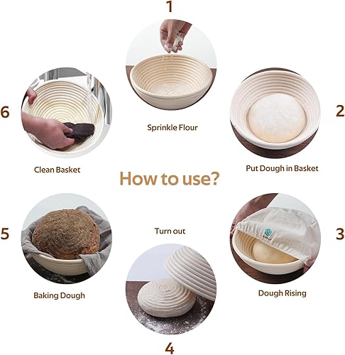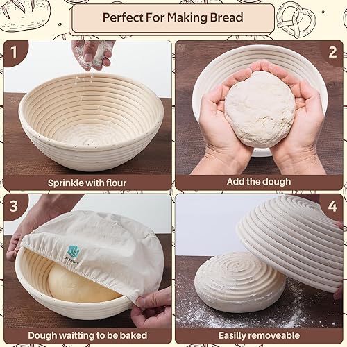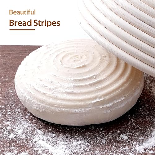 Lot de 2 Banneton pour Pain Rond de 23 cm,Corbeille à Pain+Grattoir en Métal + Grattoir en Plastique + Fouet à Pâte + Lame à Pain, Idéal pour la Pâte à Pain au Levain et à la Levure