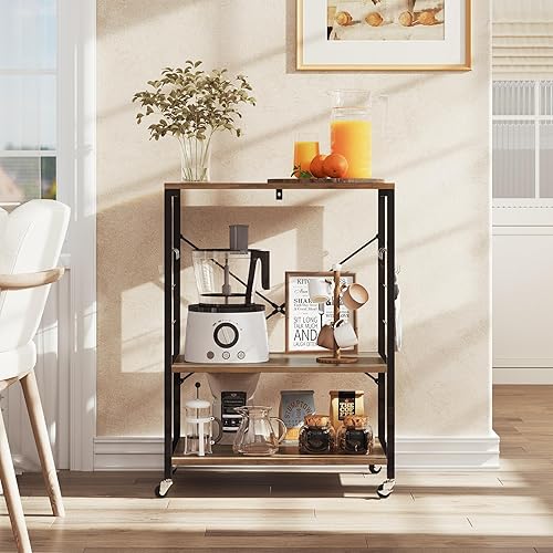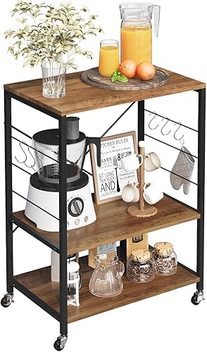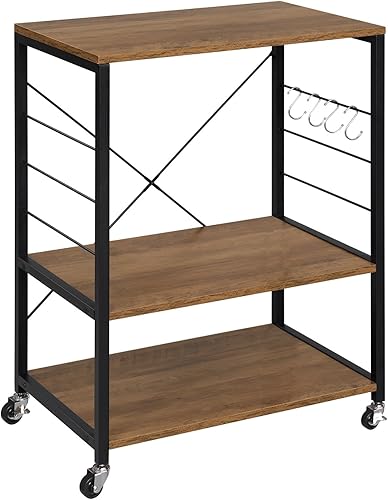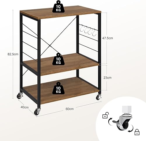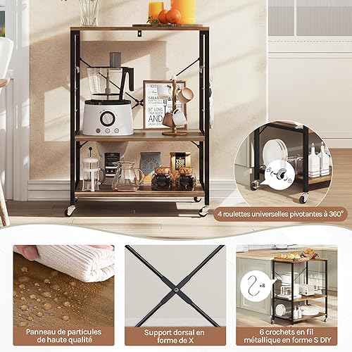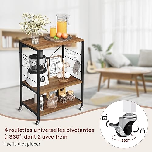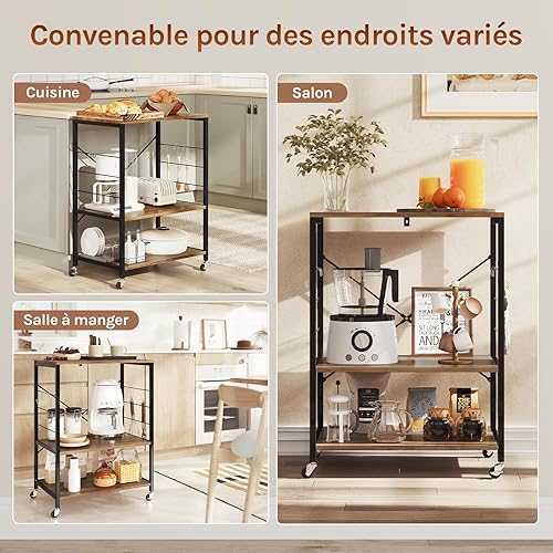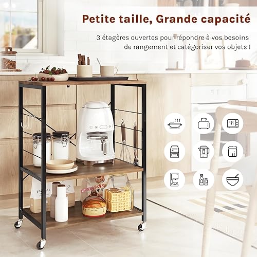 WOLTU Desserte à roulettes, Étagère Cuisine, Support Micro-Ondes à 3 Niveaux, 4 Crochets, Cadre en Métal, Bois d'Ingénierie, Blanc + Chêne Clair, 60x40x82,5cm