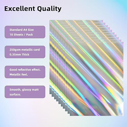 Lot de 10 cartes A4, à jet oblique, holographique, 250 g/m², 297 x 210 mm, en carton argenté métallisé, papier aluminium pour artisanat, scrapbooking, feuilles scintillantes, polies et brillantes