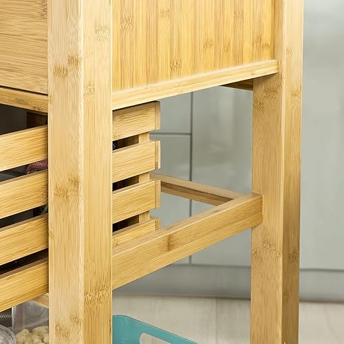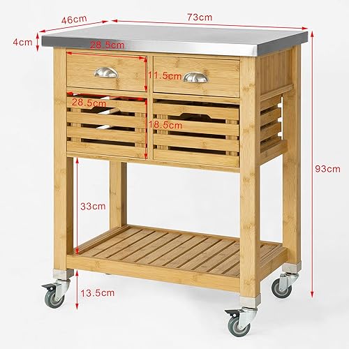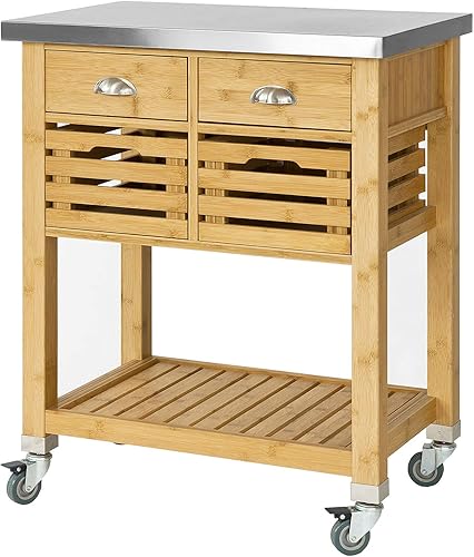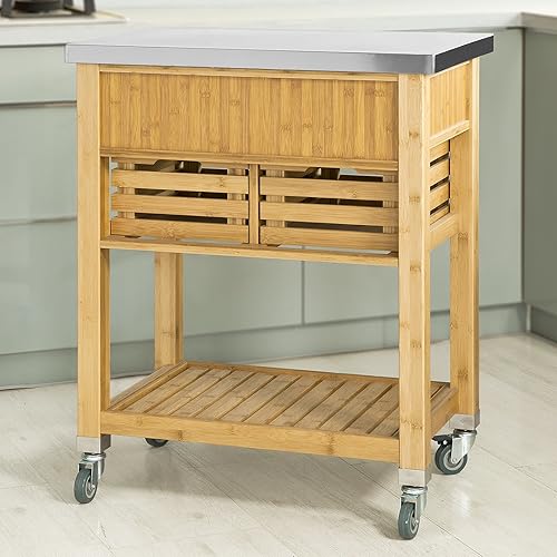 SoBuy Desserte sur roulettes Armoire de Rangement Cuisine en Bambou - Plan de Travailen en Acier INOX Résistant aux Empreintes Digitales Bambou 73x46x93cm, FKW40-N
