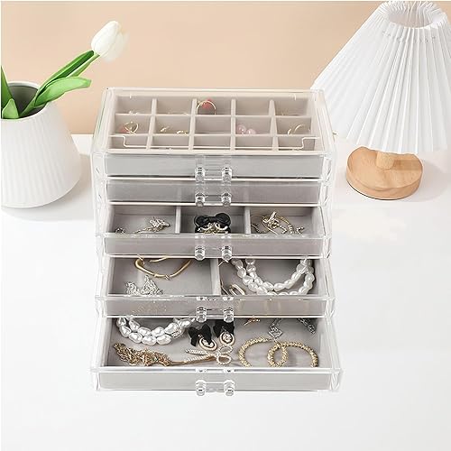 Jinavoty Boîte d'organisation de bijoux en acrylique avec plateaux en velours, organisateur de rangement transparent pour boucles d'oreilles, bagues, bracelets, colliers (beige, 3 tiroirs)