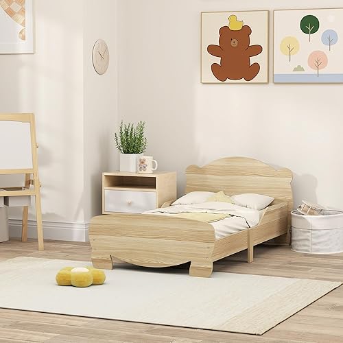 AIYAPLAY Lit Enfant lit au Sol Enfant 70x140 cm avec barrière de sécurité, sommier à Lattes Inclus et décorations d'ours, pour garçons et Filles de 3 à 6 Ans - Bois Naturel