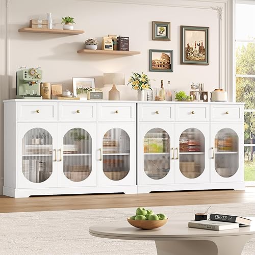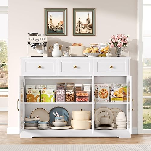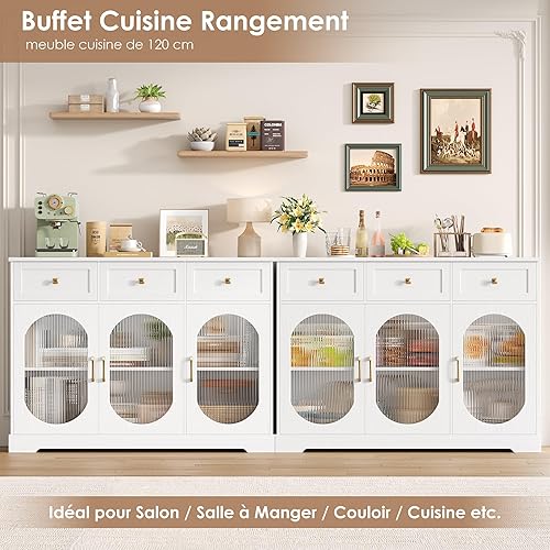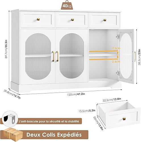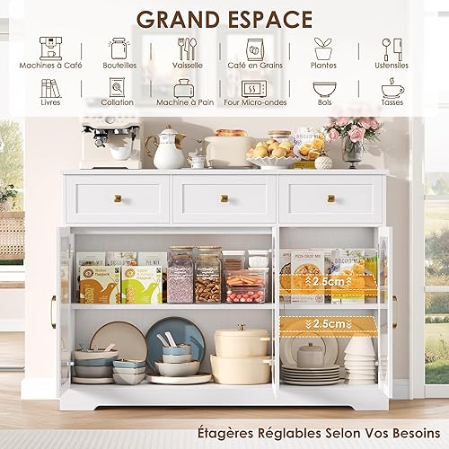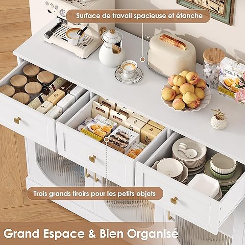 FirFurd Buffet Cuisine Meuble Cuisine Rangement avec 3 Portes Vitrées 3 Tiroirs Bufffet pour Salle à Manger Salon Étagère Réglable 120x39.8x89.7cm Blanc