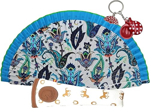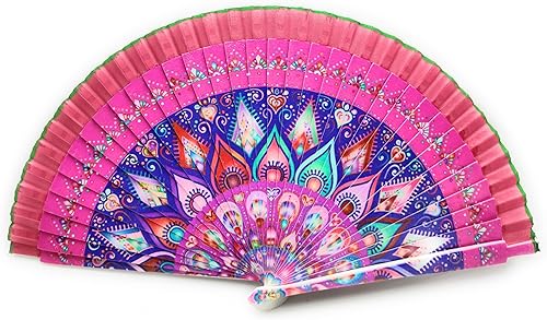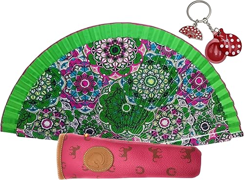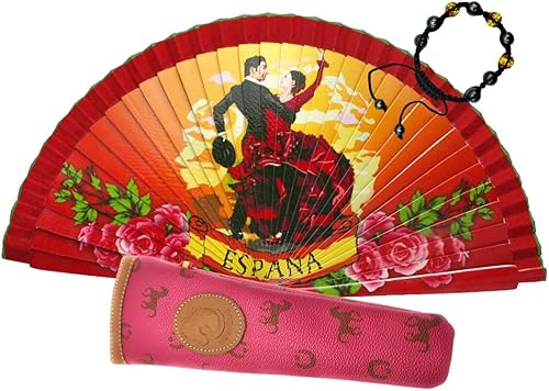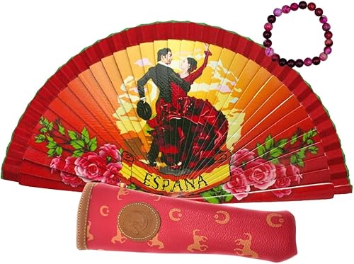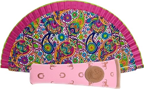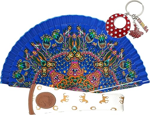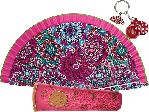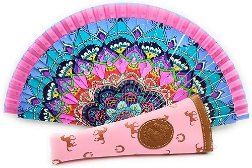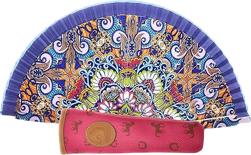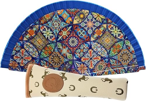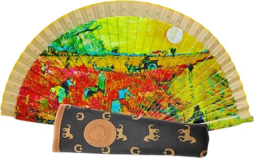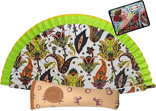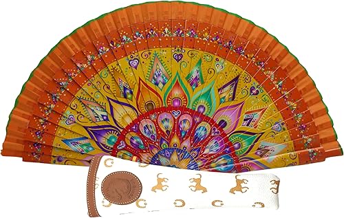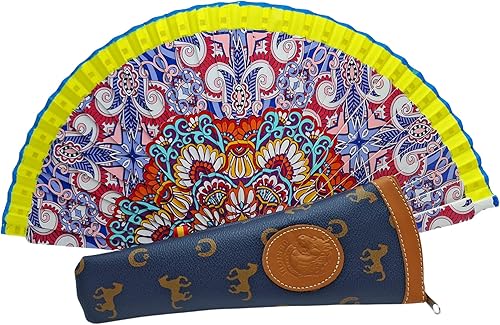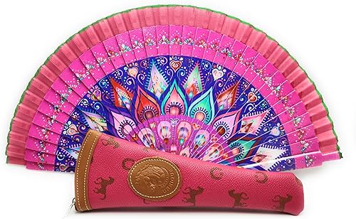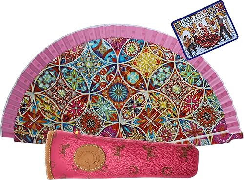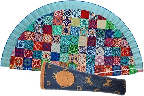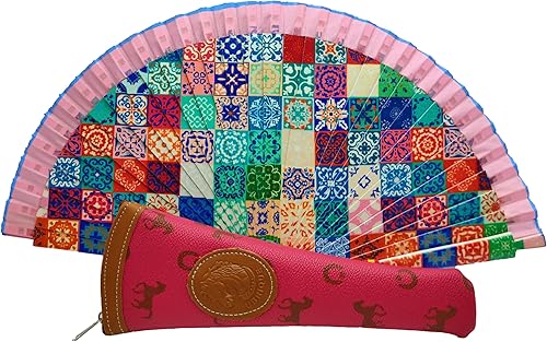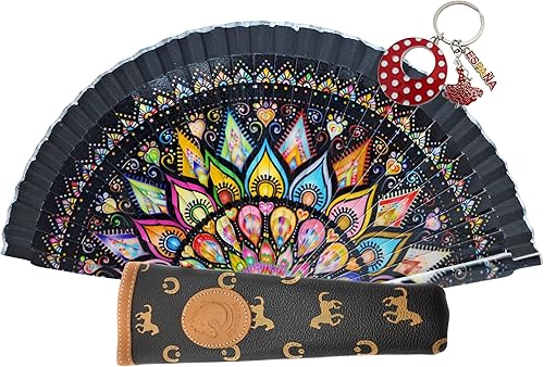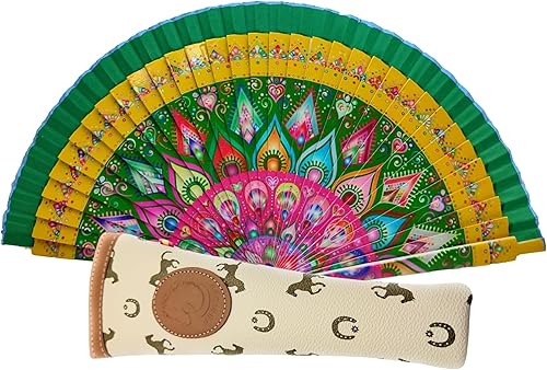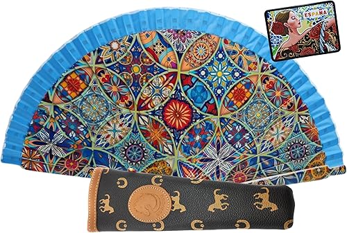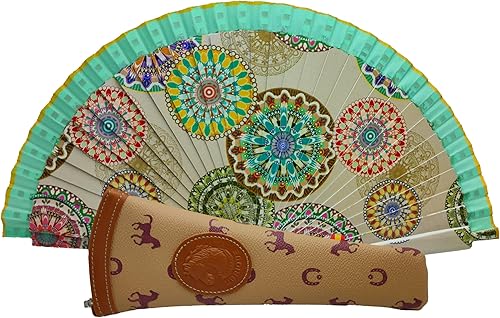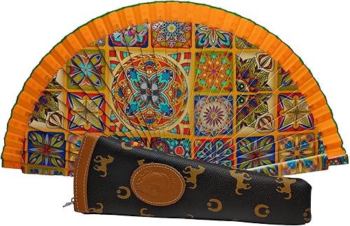 Éventails floraux, paysages et figures de couleurs avec housse artisanale. Magnifique éventail en bois avec étui fabriqué en Espagne. (Mosaïques cercles A)