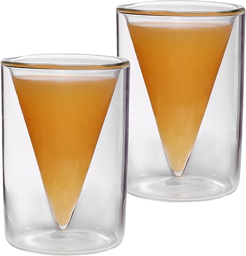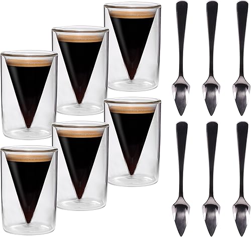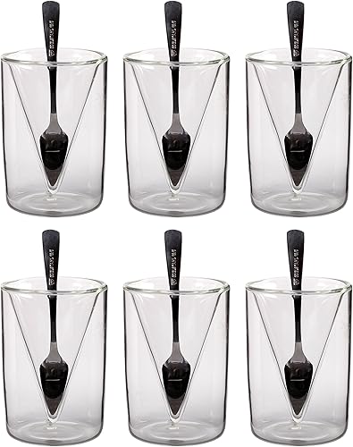 Feelino Tasse a Cafe, Lot de 6x Tasse Double Paroi avec 6 Cuillères, Tasses Cafe en Verre Original 70ml, Verre Double Paroi Design Pyramidal, Tasse Transparente Café Expresso, Lavables Lave-vaisselle