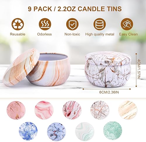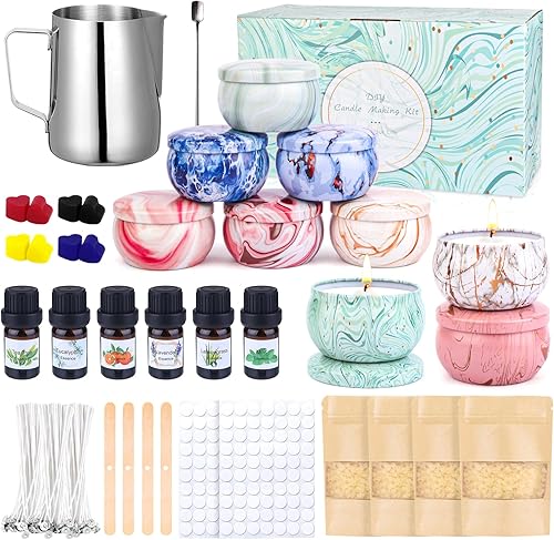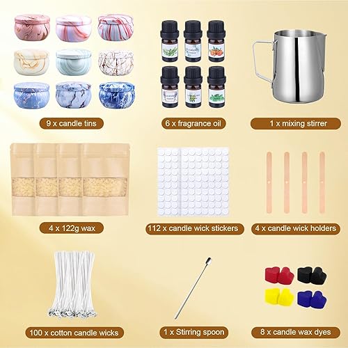 Kit fabrication bougies pour débutants DIY Set bougies parfumées Cadeaux avec 480g cire soja,9 boîtes à bougies,6 huiles parfumées,8 blocs couleur,100 autocollants Candle Wicks et Wick, 112 stickers