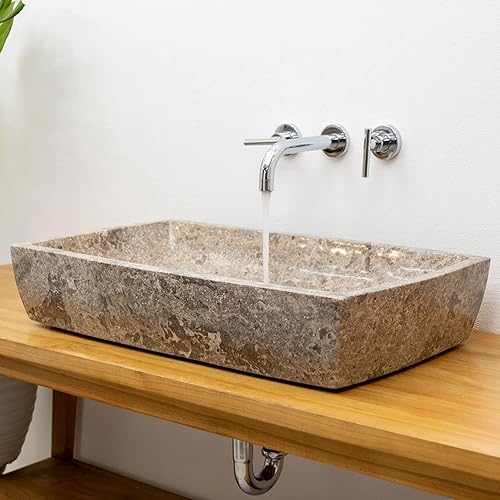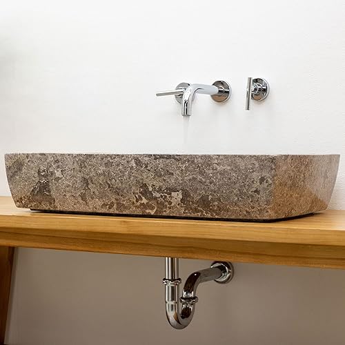 Wohnfreuden Lavabo Mara en marbre crème carré 70 cm – Lavabo à poser en pierre polie avec trou pour robinetterie au design moderne