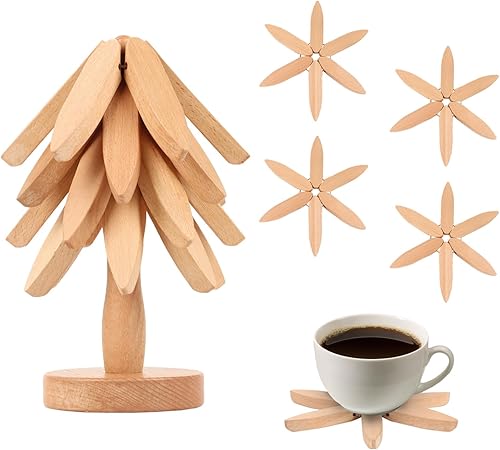 5 pièces Dessous De Plat en Bois pour Plats Chauds, Dessous De Plat Pliable en Forme d'arbre avec Support, Trivets en Bois en Forme D’Arbre, Isolation Anti-BrûLure, ProtèGe Le Plan De Travail